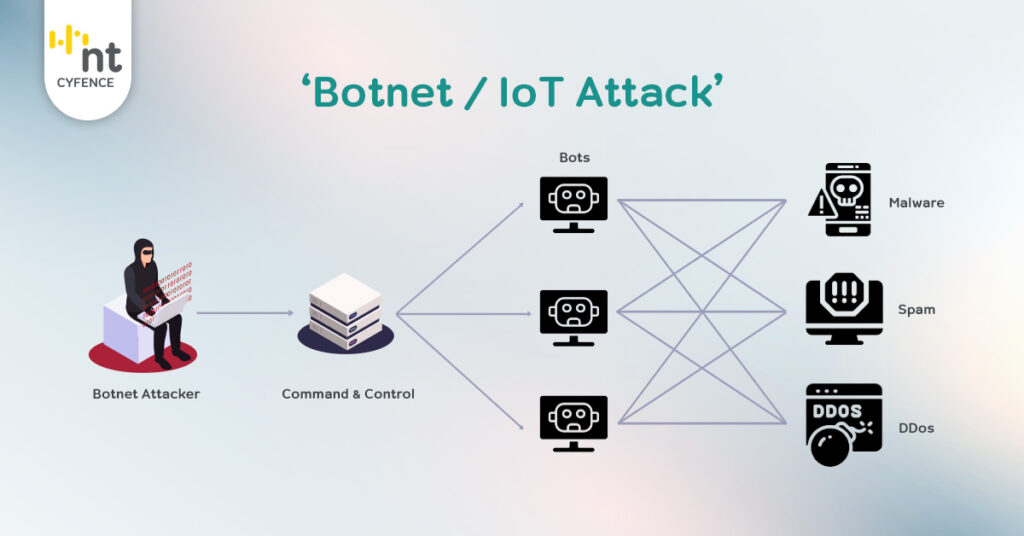 Botnet คือ เครือข่ายอุปกรณ์ IoT หรืออุปกรณ์เชื่อมต่ออินเทอร์เน็ต ที่ถูกแฮกและควบคุมโดยคนร้าย เช่น กล้องวงจรปิดเราท์เตอร์ หลอดไฟ IoT เมื่อถูกควบคุม จะถูกนำไปโจมตี DDoS, ขุดคริปโต หรือเป็นพาหะจากมัลแวร์ โดยที่เจ้าของไม่รู้ตัว ตัวอย่างเช่น บ้านที่อินเทอร์เน็ตช้าแปลก ๆ เพราะกล้องวงจรปิดที่บ้านกำลังถูกใช้โจมตีเว็บไซต์อื่นอยู่ในเบื้องหลัง