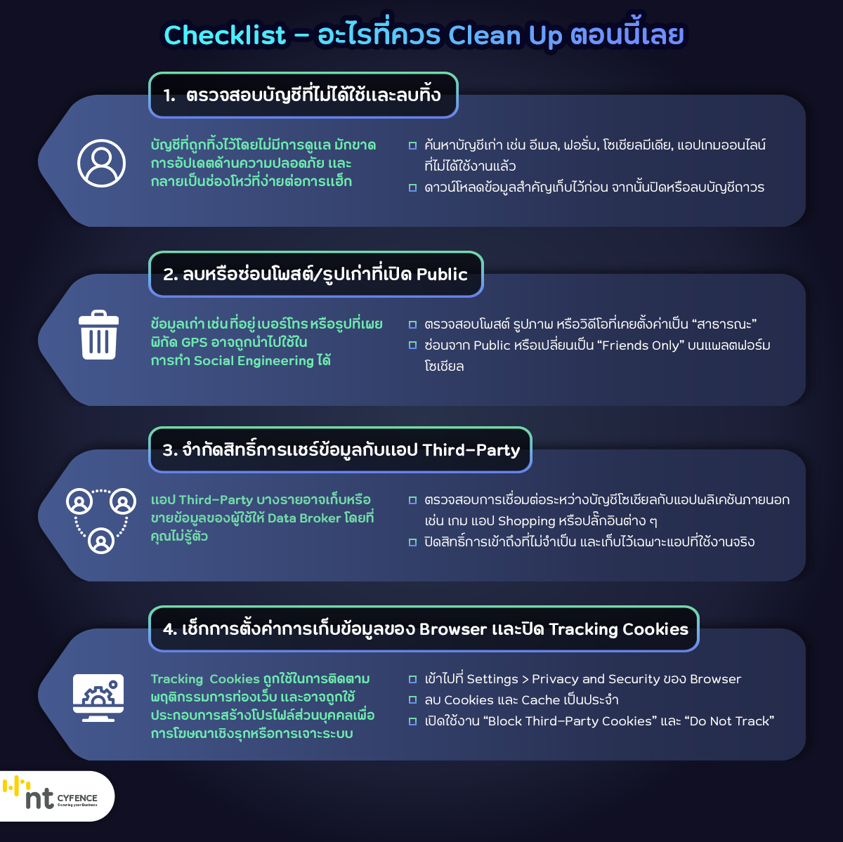 การ “ล้างรอยดิจิทัล” ไม่จำเป็นต้องซับซ้อนเสมอไป จุดเริ่มต้นที่สำคัญคือการตรวจสอบและจัดการข้อมูลที่เราเปิดเผยโดยไม่ตั้งใจ เพื่อปิดช่องโหว่ที่อาชญากรไซเบอร์สามารถใช้ประโยชน์ได้ นี้คือ Checklist ขั้นพื้นฐาน ที่ทุกคนสามารถทำได้ทันที
