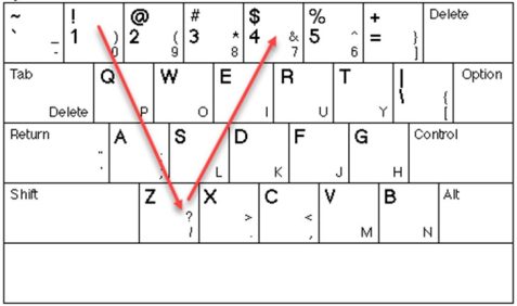 เช่น ตัวอักษร V ให้กดปุ่ม 1qazse4 หรือหากต้องการให้ซับซ้อนขึ้น สามารถใช้วิธีกด SHIFT เพื่อสร้างรูปแบบคละตัวอักษรพิมพ์ใหญ่และพิมพ์เล็ก ได้ตามนี้