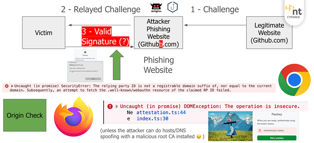 - ผลลัพธ์: เมื่อเบราว์เซอร์ทำงานบนโดเมน mybank-login.com อุปกรณ์จะมองหา Passkey ที่ผูกกับ mybank-login.com เท่านั้น ซึ่ง “ไม่พบ” มันจึง ไม่เสนอ Passkey ของ mybank.com ให้ผู้ใช้งานเลือก และเมื่อ