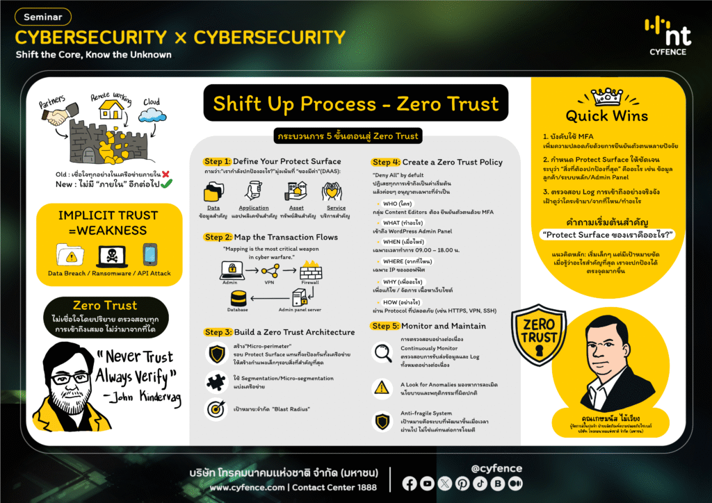 กล่าวถึง Zero Trust ไม่ใช่แค่แนวคิดเชิงทฤษฎี แต่คือแนวทางปฏิบัติที่ทุกองค์กรต้องเข้าใจอย่างถูกต้อง และเจาะลึก ‘5 ขั้นตอน’ ตามแนวทางของ John Kindervag ผู้สร้างโมเดล Zero Trust พร้อมกรณีศึกษา Website Security ที่เห็นภาพชัดและนำไปใช้ได้จริง เพื่อพลิกแนวทางการป้องกัน จากการวิ่งไล่ตามช่องโหว่ สู่การสร้างสถาปัตยกรรมความปลอดภัยที่มั่นคง ยั่งยืน และสอดคล้องกับมาตรฐานของไทย